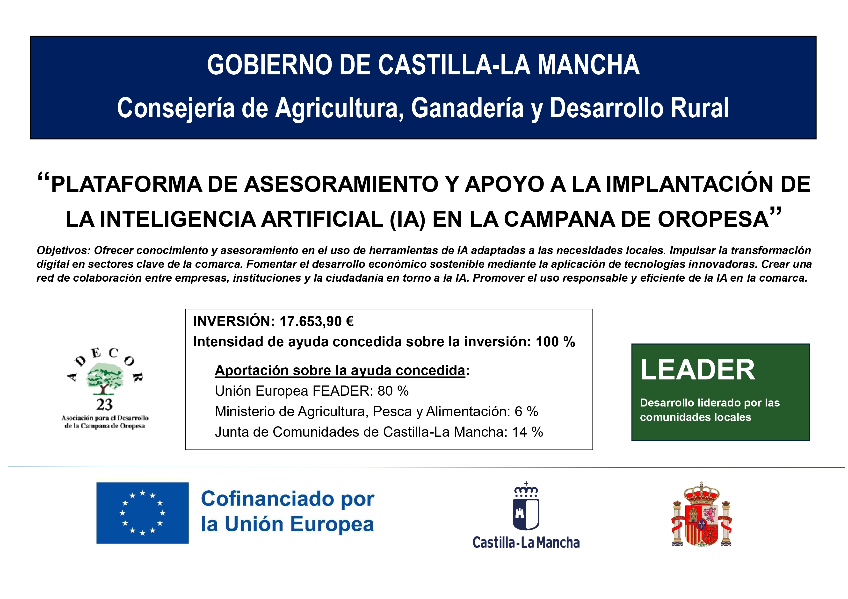 A su vez, el director general de Desarrollo Rural, José Juan Fernández, recordó que estas ayudas forman parte de la Intervención 7119_Leader en Castilla-La Mancha en el marco del Plan Estratégico de la PAC 2023/2027 (PEPAC), que cofinancian la Unión Europea (80%), la Administración General del Estado (6%) y la Junta de Comunidades de Castilla-La Mancha (14%).